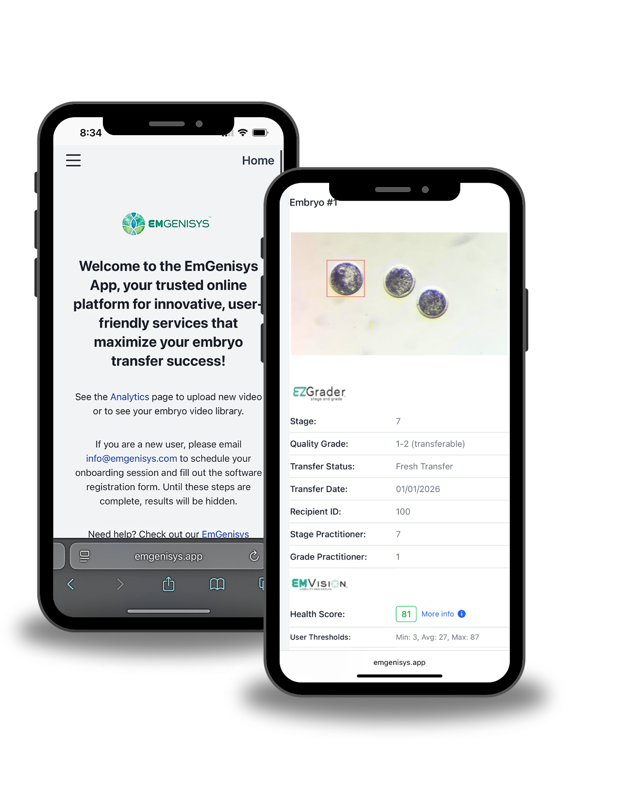 Evaluate the health & viability of your embryos in the lab or chute side. Simply record a 30 second video of your embryos in culture media and let our data-driven, machine learning platform do the rest. In seconds, you will receive a comprehensive report to empower you with the data you need to select the healthiest embryos for transfer.